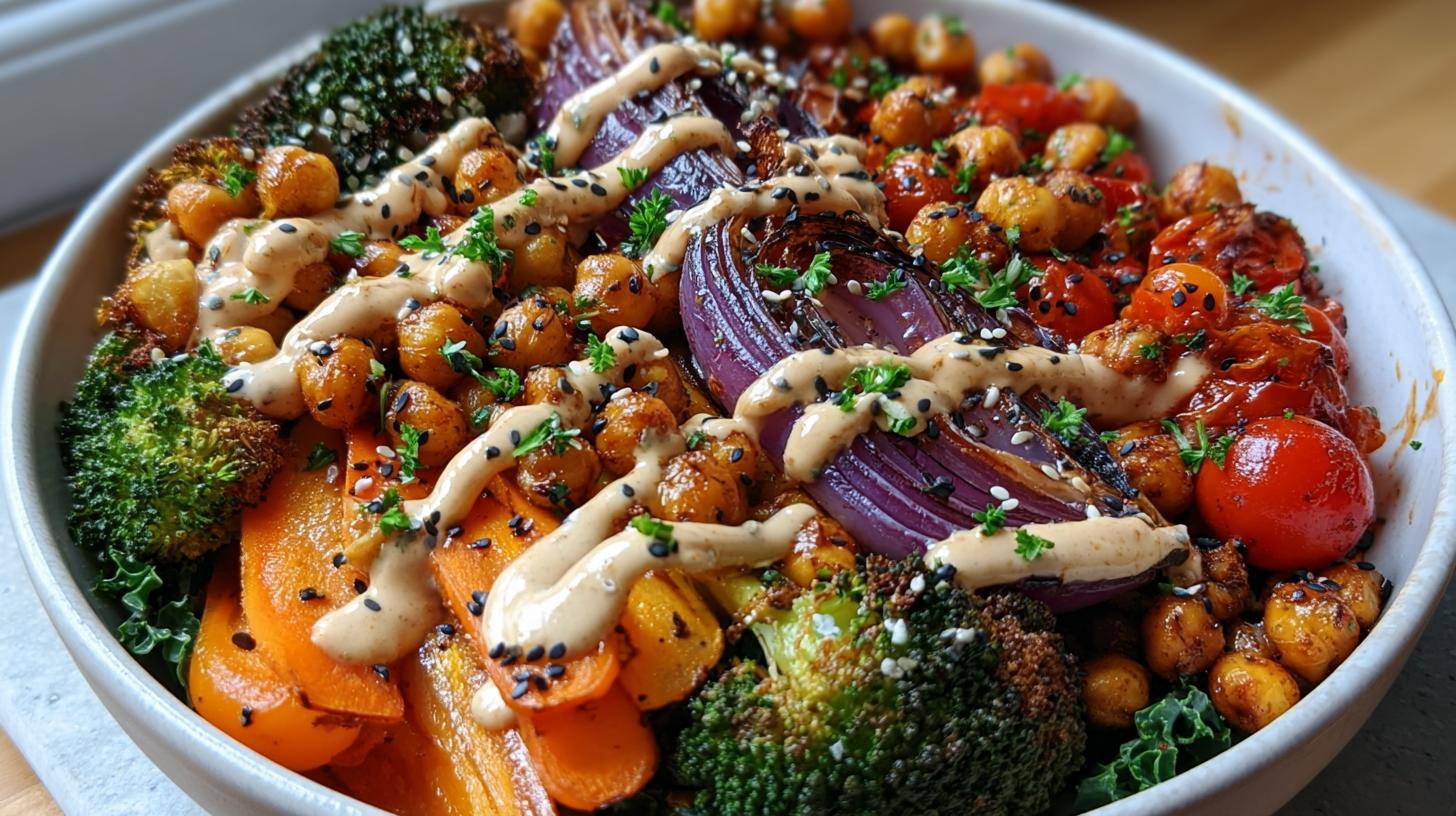A delicious and healthy roasted vegetable and chickpea bowl with creamy tahini dressing. Perfect for meal prep or a quick dinner.